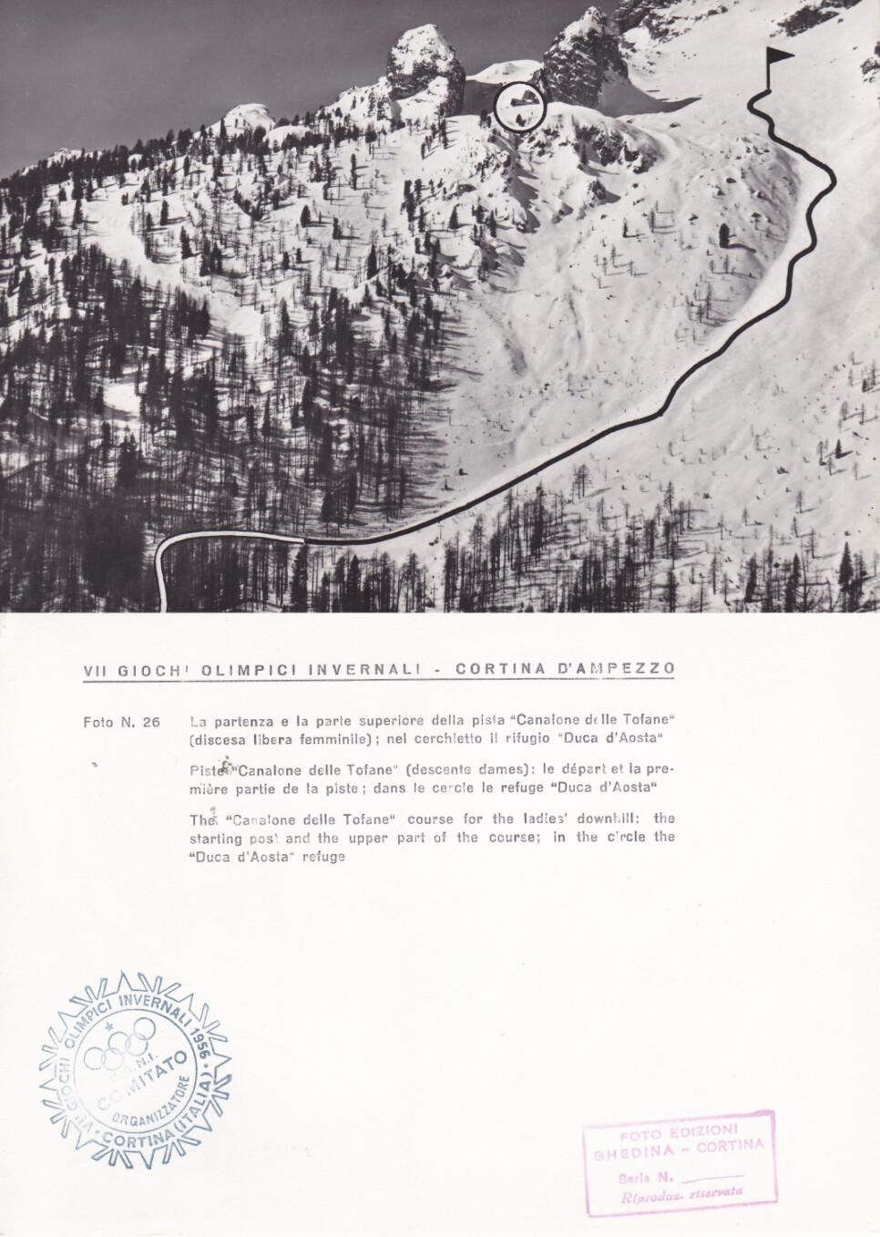 Fu scelta quella del famoso «Canalone», sul fianco della Tofana, considerata una pista ormai classica e la piùrinomata della zona. Qui furono sufficienti modesti lavori di livellamento, perchè in pratica tutto il terreno era già preparato da molti anni. Il tracciato partiva da quota 2.114 metri con arrivo a quota 1.612 metri. La lunghezza risultò di metri 1.552 con un dislivello di 502 m. Porte impiegate: 20. Questa pista, come del resto anche quella maschile, aveva il grande vantaggio che poteva essere vista anche da Cortina. Era il percorso di gara più libero, anche se molto difficile; da cima a fondo non c'era un albero e la discesa presentava un andamento quasi rettilineo, spezzato unicamente dalle porte di controllo.